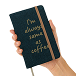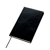 落ち着いたカラーとレザー調ハードカバーが高級感を演出。携帯も書き込みもしやすいサイズのノートです。