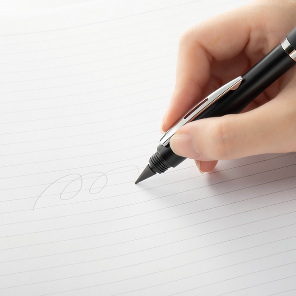 鉛筆のように書けて、消しゴムで消すことができるほか、芯が硬く折れにくい構造で耐久性も抜群。