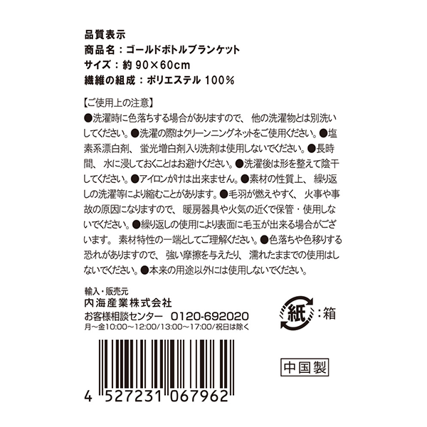 積み上げ展示に最適な円柱型の輝くゴールドボトルパッケージにベーシックなブランケットを入れた、ディスプレイ映えするアイテムです。 ピラミッド型に積み上げれば遠くからでもよく目立つPOP効果を発揮します。
