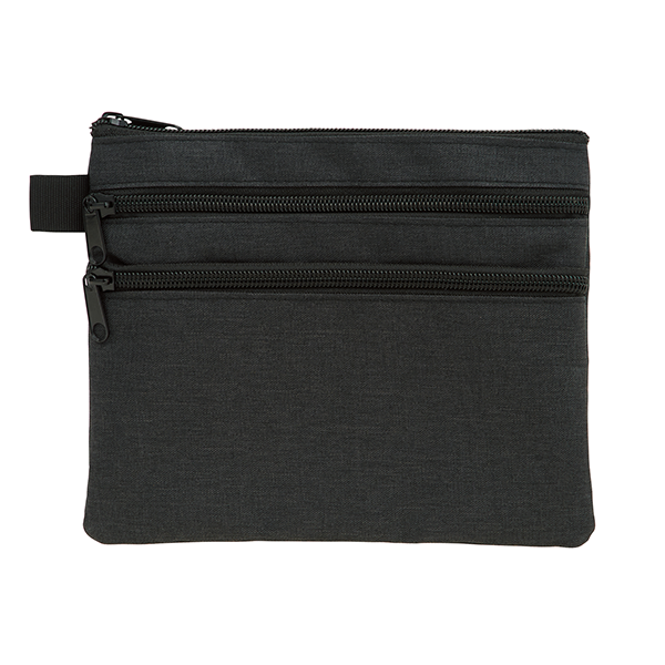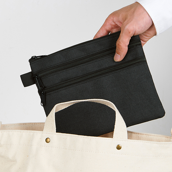 ごちゃつきがちなモバイル周辺機器やステーショナリー類を3つのポケットに整理して持ち運べる、便利なビジネスシーン向けポーチです。 カードやメモ類の整理、エチケット用品、持ち歩き用の小物、などシンプルな構造なので用途はアイデア次第!ビジネスパーソン・学生向けの名入れ案件などにオススメです。
