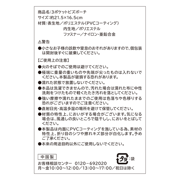 | 素材 | 表生地/ポリエステル(PVCコーティング)、内生地/ポリエステル、ファスナー/ナイロン・亜鉛合金 |