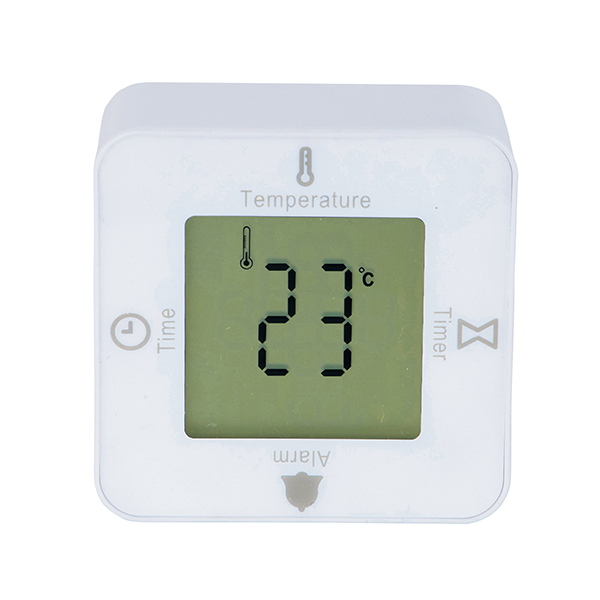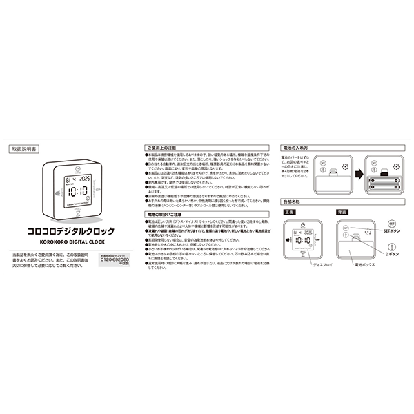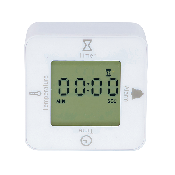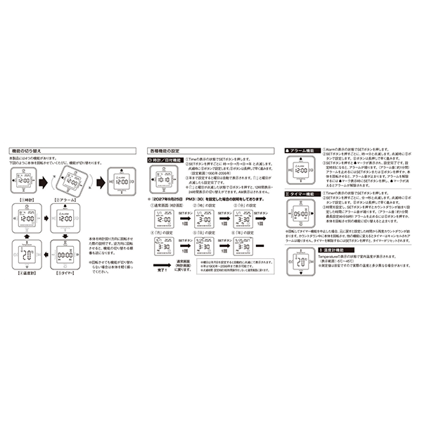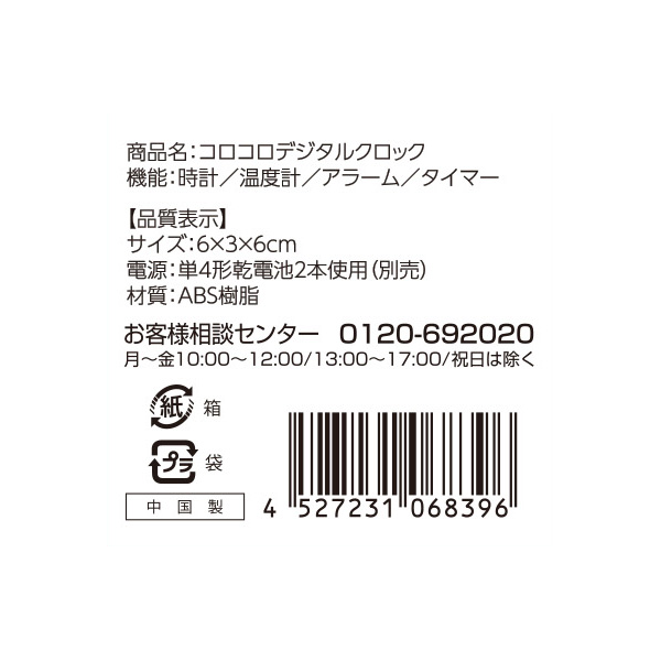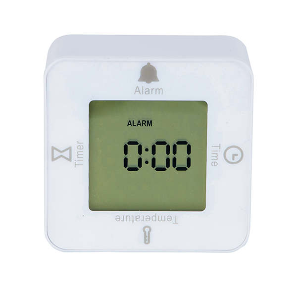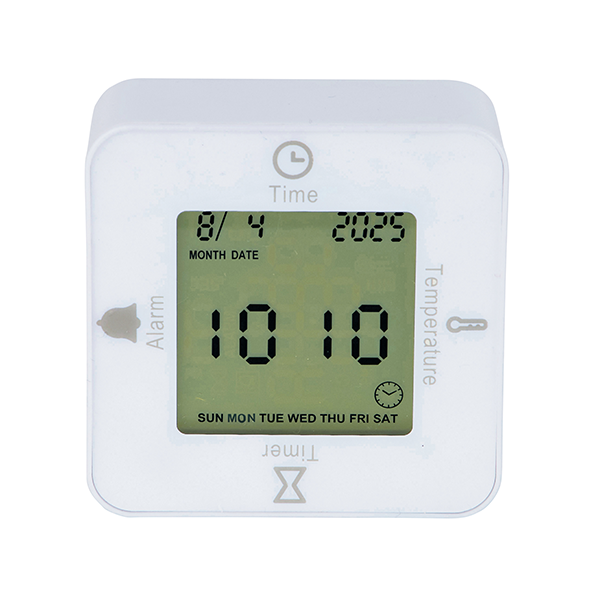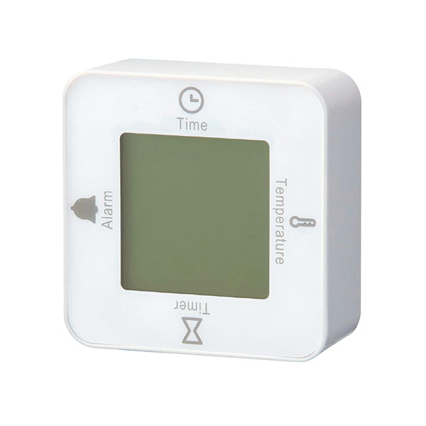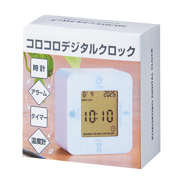 時計・アラーム・温度計・タイマーの4つの機能が付いた、手のひらサイズの卓上時計です。 コロコロ回転させて4WAYに楽しく使いこなそう!
