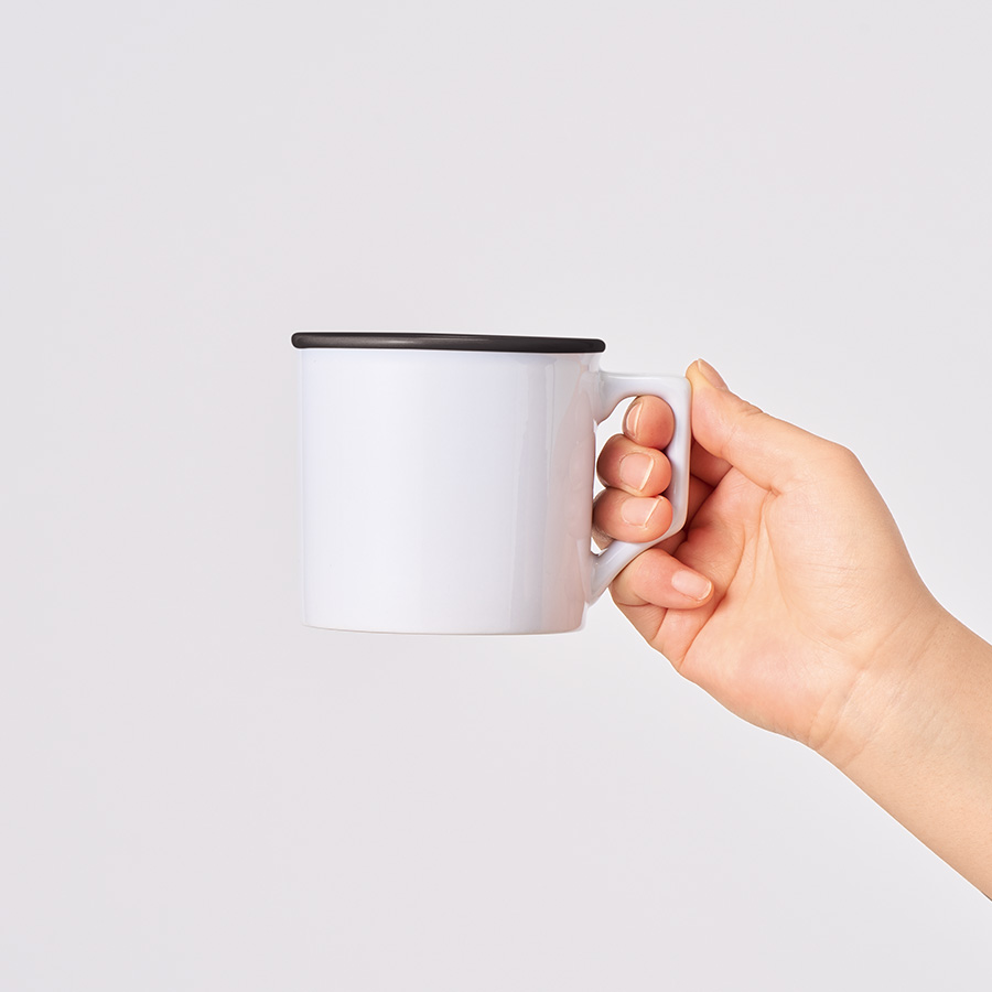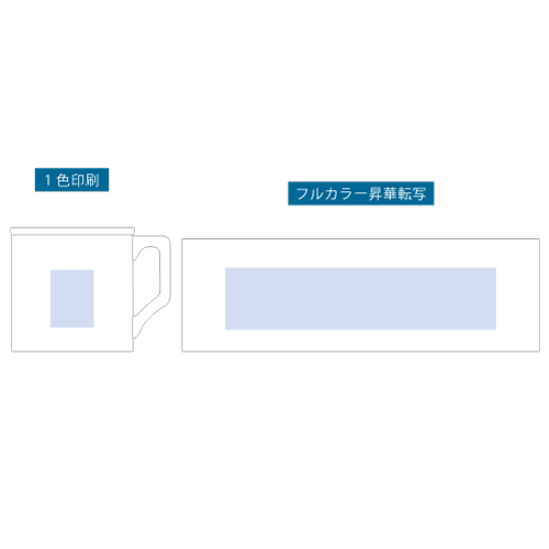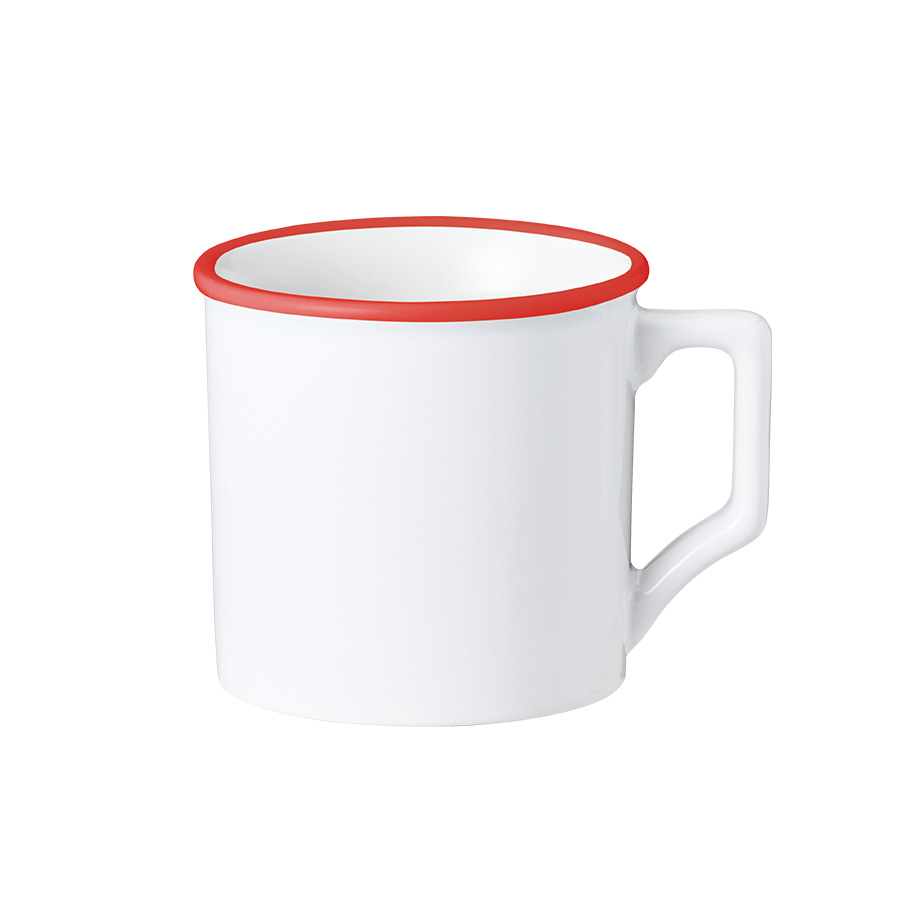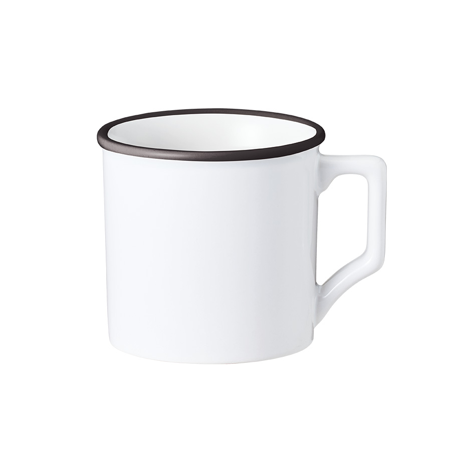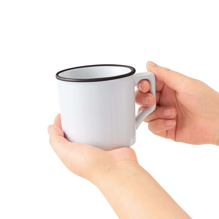 ホーロー製のマグカップの定番、口元をふっくらとさせたデザインを陶器で再現し、側面に昇華転写のフルカラー印刷が出来るようにしたマグカップです。