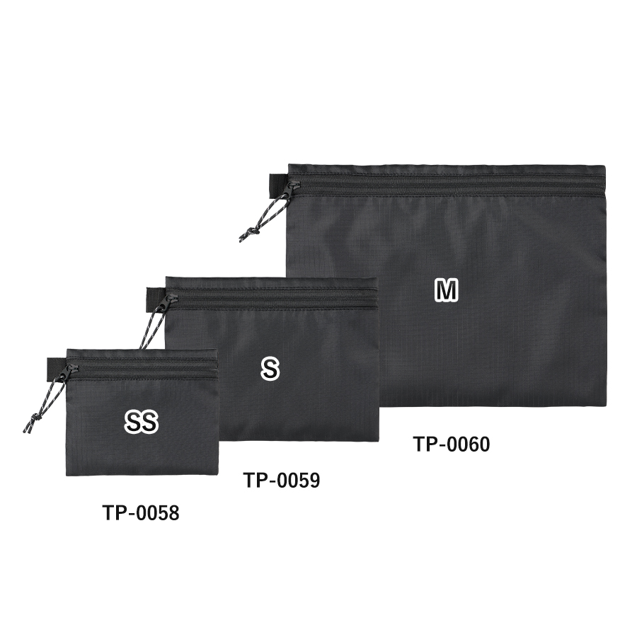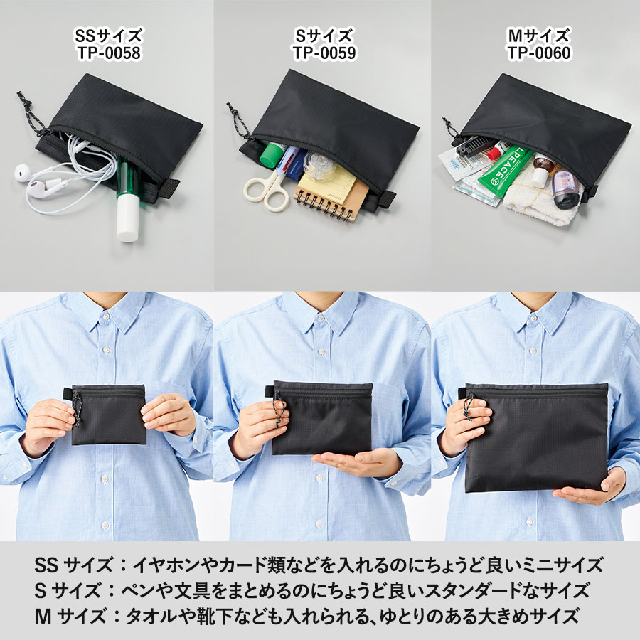 SS・S・Mの3サイズ展開で、SSサイズはイヤホンなどの小物をまとめたり、カード、コインケースなどとしても便利です。