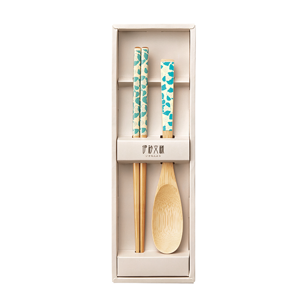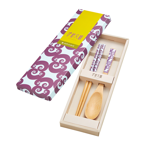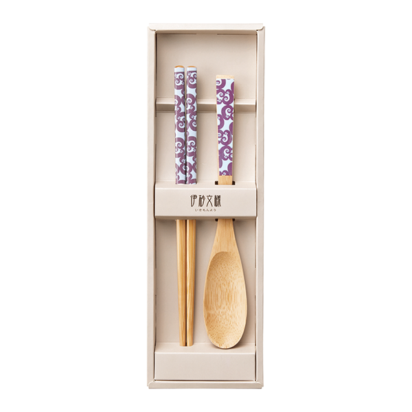 実用性の高い木製の箸とスプーンをセットにしました。 歴史ある京都の伝統柄『伊砂文様』の化粧箱で特別感漂う版権商品です。