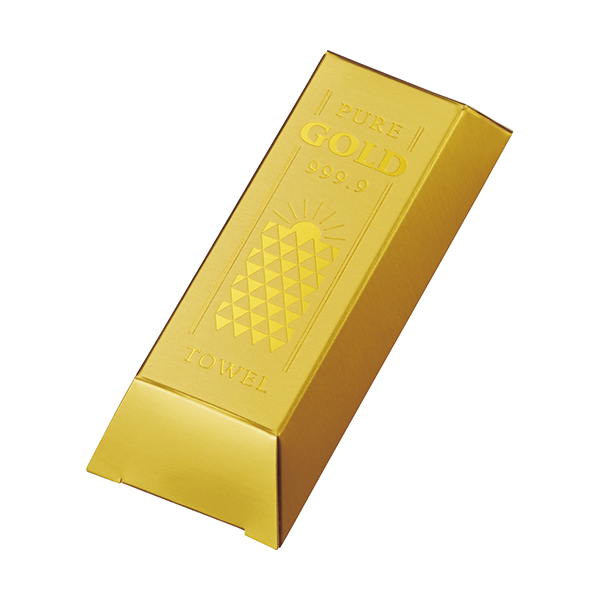ゴールドバー風パッケージがディスプレイ映えするユニークなタオル。 キラキラ光り高級感のある箔押しがポイントです。ふわふわの優しい手触りも嬉しい一品です。