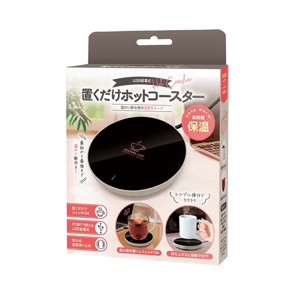 置くだけで温かい飲み物の温度がキープできる、USB給電式のホットコースターです。 滑り止め付きなので、デスクで安心して使えます。