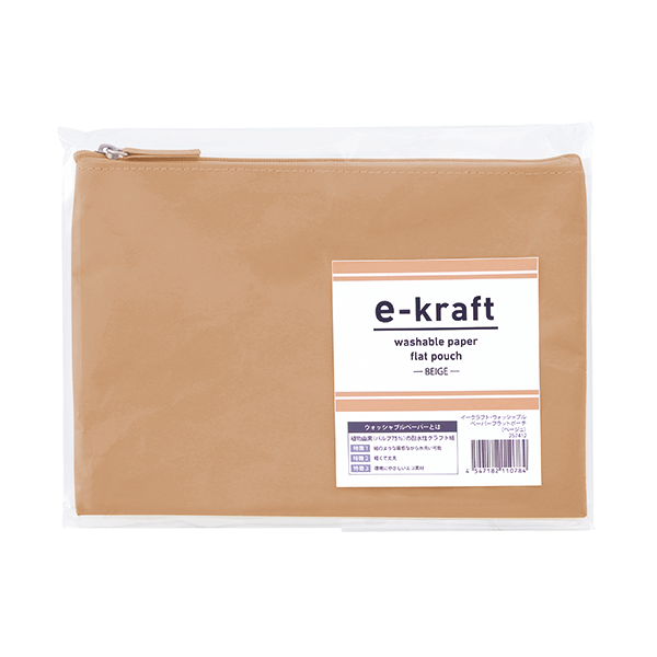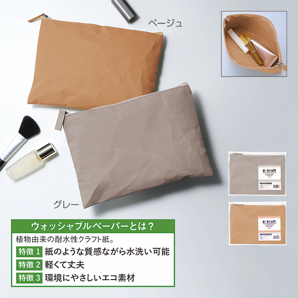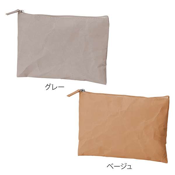 性別問わず使えるナチュラルカラーのシンプルポーチ。フラット型なのでバッグの中にもすっきり収まります。 水に強いウォッシャブルペーパーを使用しているので、洗面所に持ち込んで使うときも濡れて水浸しになる心配がありません。シンプルかつ機能的なポーチです。