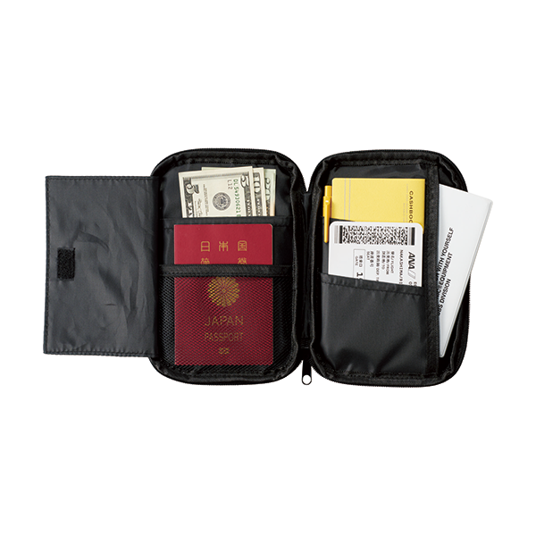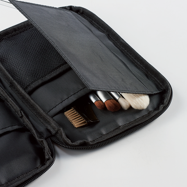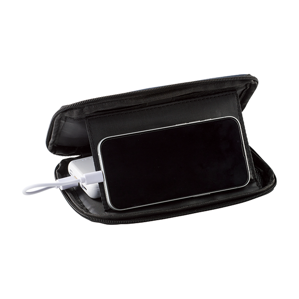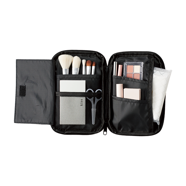 文具やモバイルグッズ、コスメの整理等に役立つ、5つのポケットが付いた便利なポーチです。 スマホやミラーが置けるスタンド機能もポイント。