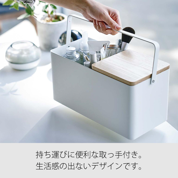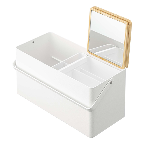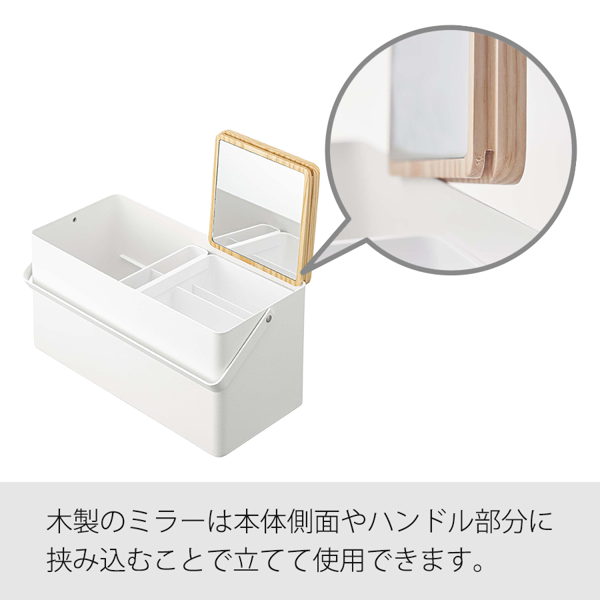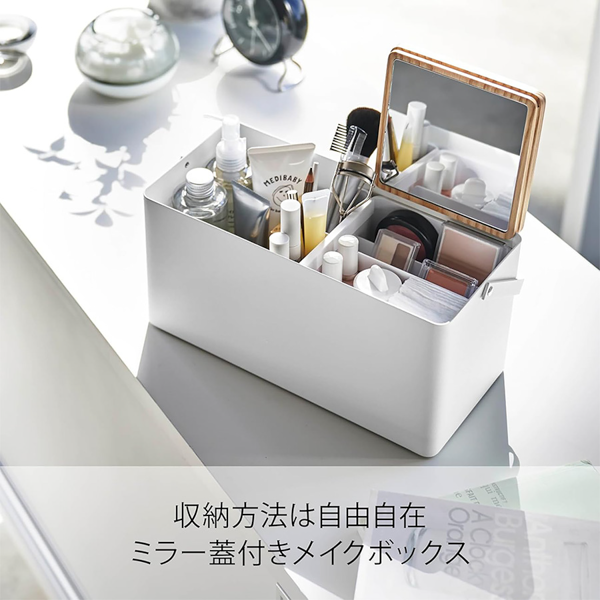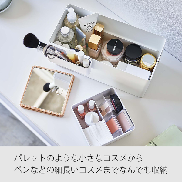 収納を自分好みにカスタマイズできるメイクボックスです。 2サイズの便利な収納トレーと、木蓋の裏にミラーが付属しています。大きめのトレーはパレットなどの小さなコスメを立て掛けて収納できるサイズ感。スライド式でメイクボックス内を簡単に移動できます。小さなトレーはペンなどの細長いコスメを立てて収納できる薄型。フック付きでメイクボックスのフチに引っ掛けて使用できます。