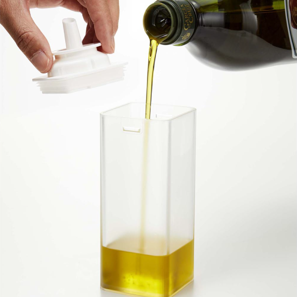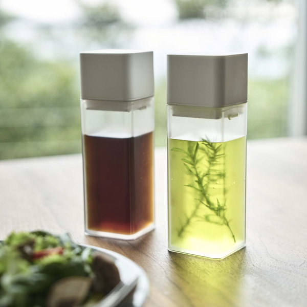 倒してもこぼれる心配なし!液体調味料をすっきり整理できる保存容器です。