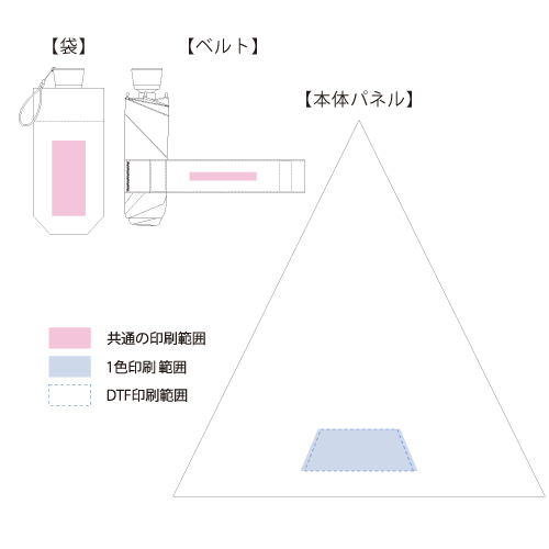 | 1色印刷範囲 | 袋/W40×H90mm、ベルト/W80×H10mm、パネル/W140×H50mm |