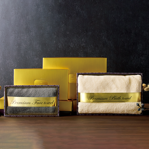 お肌にやさしくふれるやわらかな手ざわりのフェイスタオル。ゴールドの帯を巻いて、箱を開けた時の驚きまでもプレミアム。贈答品に最適な身蓋式の化粧箱がその価値をさらに高めます。