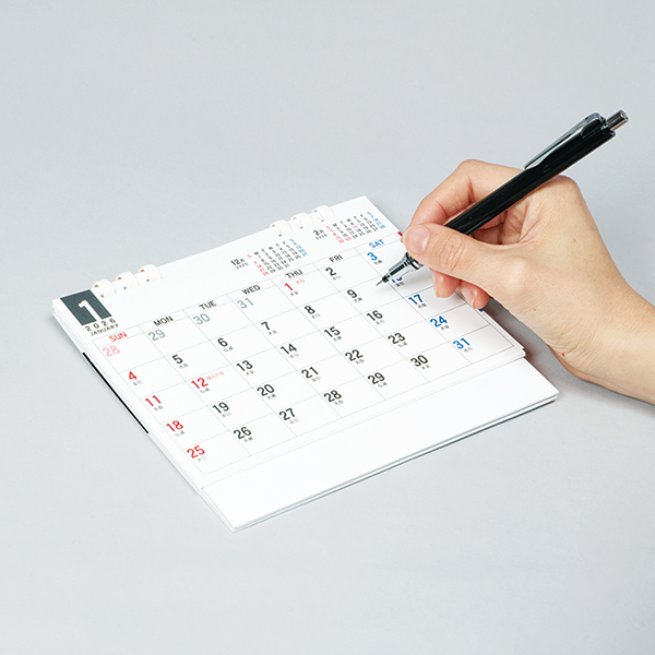 | 素材 | カレンダー部分/マットコート紙135kg 台紙/サンカード40kg リング/eco紙プラリング(紙51%、PP49%) 名入れカード(オプション):マットコート紙135kg |