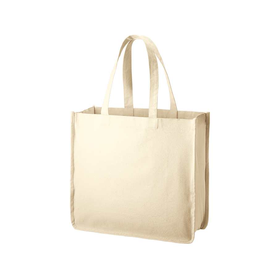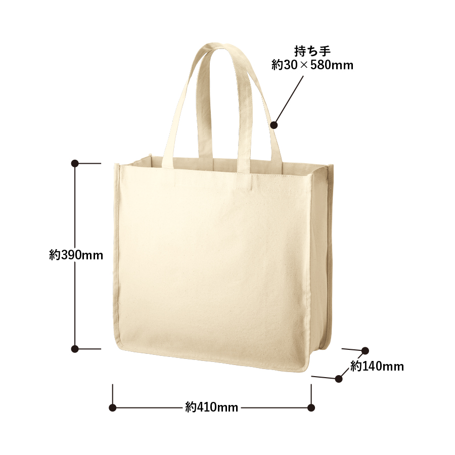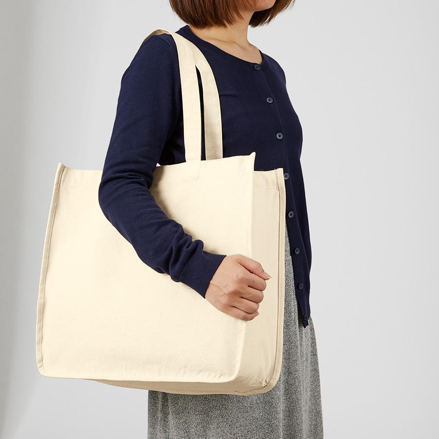 四角いフォルムが可愛い、スクエアタイプです。肩掛けできる長めの持ち手で、持ちやすさにも配慮しました。大判のうちわも入るサイズなのでイベント時に大活躍。目が細かく印刷が綺麗に出る生地なので繊細なデザインもばっちりプリントできます。印刷面が広くフルカラー印刷もできるため、キャラクターやアーティストを名入れして物販のオリジナルグッズとしてもおすすめ。厚みは12オンスと非常にしっかりした生地なので普段使いのトートバッグにぴったり。ノベルティだけでなく販売品としても人気があります。本体カラーナチュラルは蛍光増白剤を使わない無漂白タイプなのでバッグの内側にエコマークがついています。環境にやさしいトートバッグとして、学校のSDGs普及の教材としてお子さまに配布したり、イベントでノベルティとしてお渡しするのにも向いています。ひとまわり小さいMサイズもございます。
