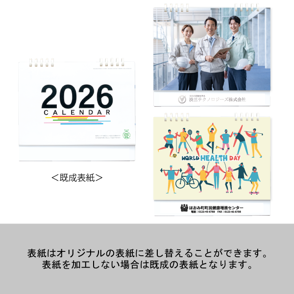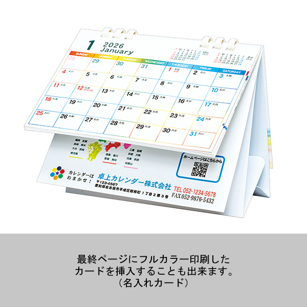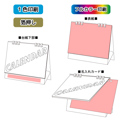 | 素材 | カレンダー部分/マットコート紙135kg 台紙/サンカード40kg リング/eco紙プラリング(紙51%、PP49%) 名入れカード(オプション):マットコート紙135kg |
