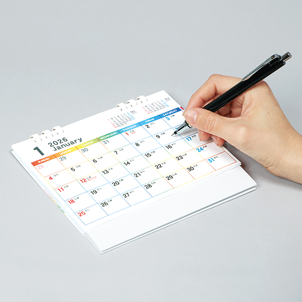 カラフルなデザインが特徴の使いやすい定番サイズの卓上カレンダー。