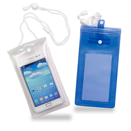 ストラップで首掛けできる防水スマホポーチ。国際規格のIPX8基準に合格しており、水遊びやウォーターイベントで安心して使えます。