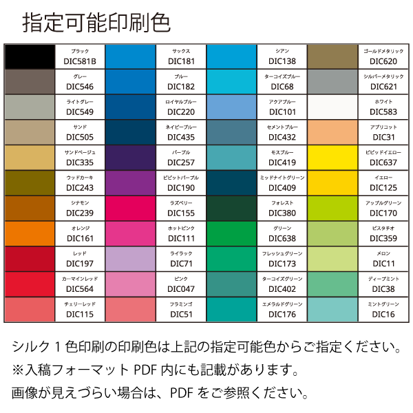 | 備考 | 【名入れ可能商品】 印刷は1箇所のみご指定可能です。 シルク印刷の印刷色は入稿PDF内記載のあるDICの色見本の中からご指定ください。その他のDIC、PANTONEはご指定いただけません。 |
