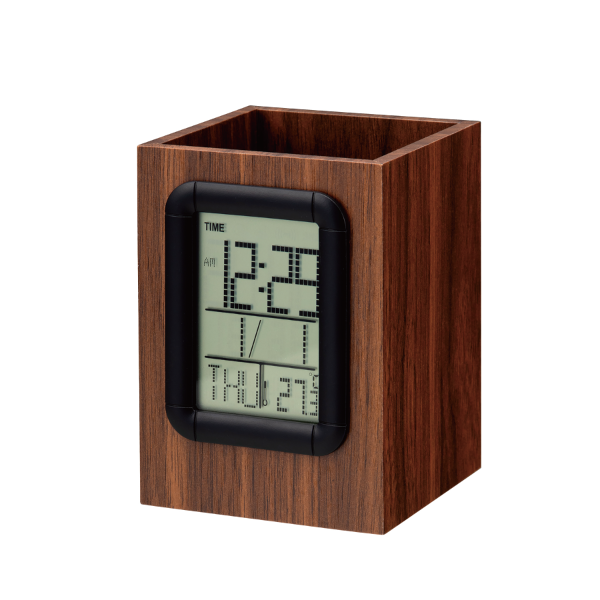 ペン立てと時計が一体になったおしゃれなウッド調ペンスタンドクロックです。 机上もスッキリ整理されます。正面に大きく表示される時計は、時計・温度・カレンダー・アラーム・タイマー・ペンスタンドと機能満載!MDF(Medium Density Fiberboard:中密度繊維板)と呼ばれる、間伐材や端材のチップを原材料としており、サステナブルなアイテムをお求めの方にもぴったりの一品です。