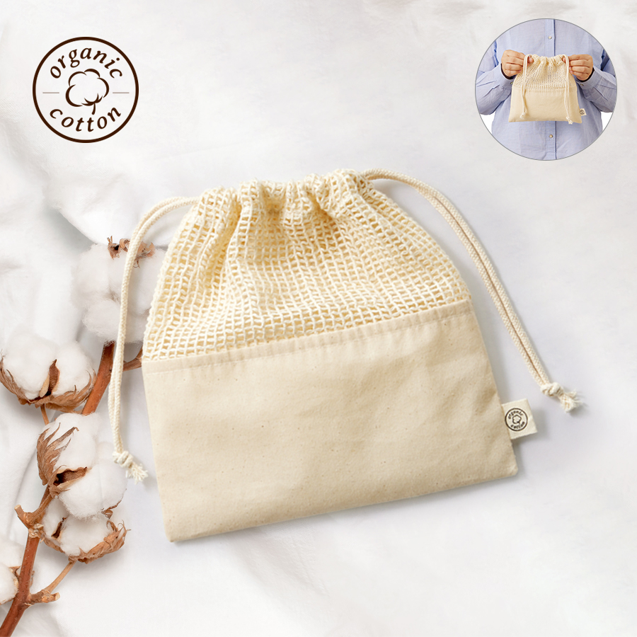全ての生地にオーガニックコットンを使用したネットタイプの巾着です 本体上部がネット素材のため、中に入れるものを見せて収納することが可能です。また、本体下部は生地部となっているため、中身が飛び出る心配もなくお使いいただけます。 サイズ感はモバイルグッズからハンドタオルなどがぴったりの大きさで、同型商品にLサイズもございます。 本体下部に単色印刷からフルカラー印刷まで名入れが可能で、企業ロゴを入れれば販促効果もばっちりです。 オリジナルギフトパッケージや物販品としてもおすすめの商品です。