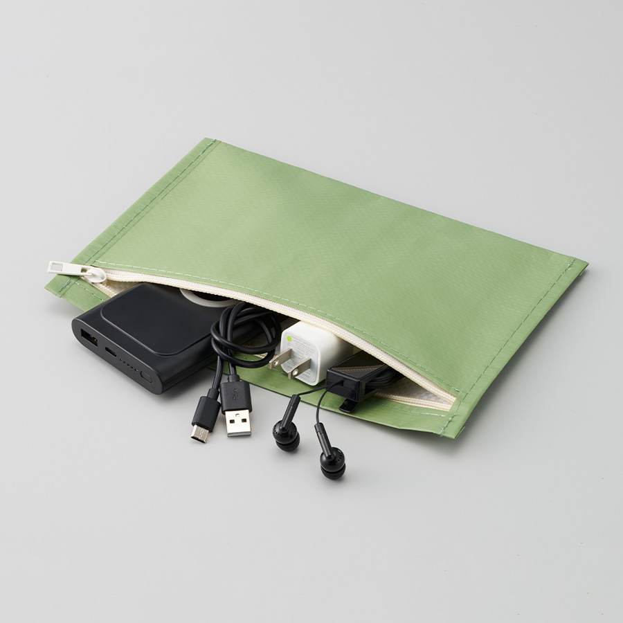 軽いレジャーシート素材で作られた持ち運びに便利なポーチです。