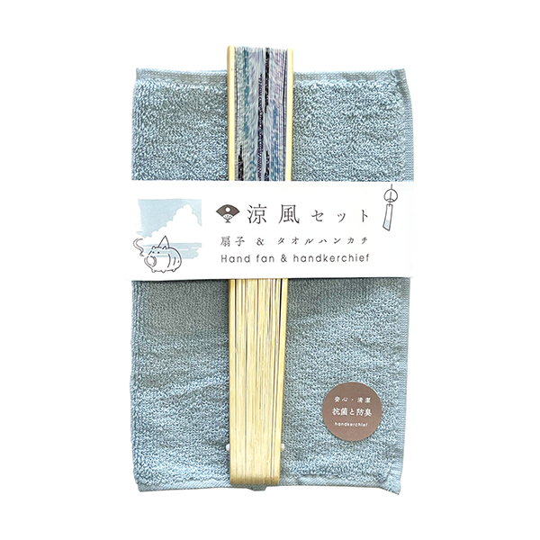 【印刷あり:100個~1本単位、印刷なし:40本以上20本単位】はずむようなてまりの絵柄が軽やかな扇子と、今治ハンドタオルをセットにした夏のギフトです。