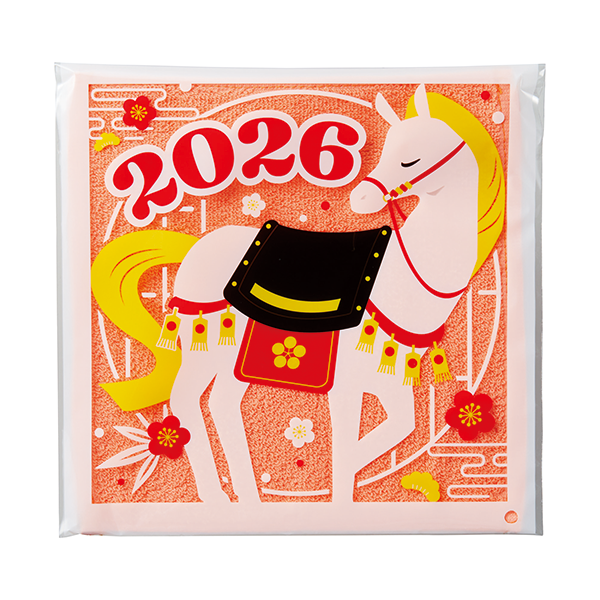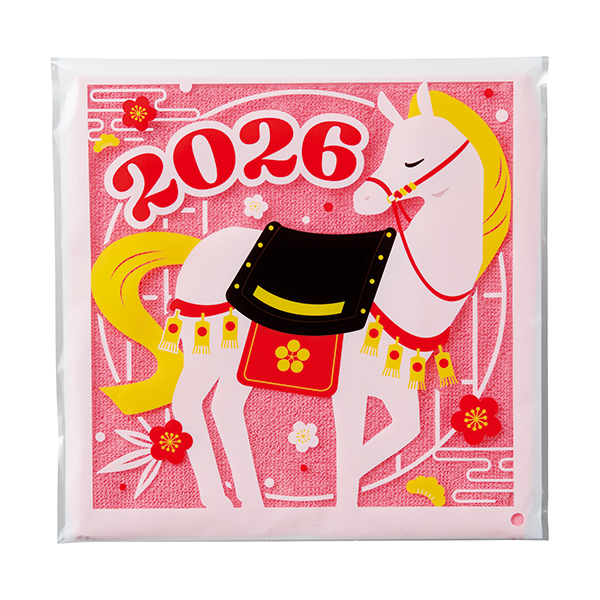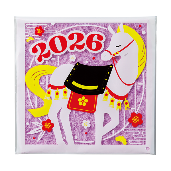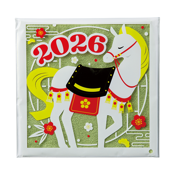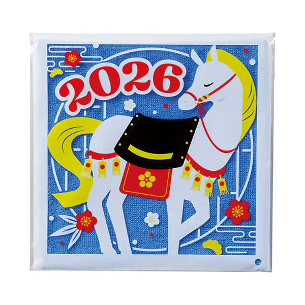 新年のご挨拶にぴったりな年始の定番アイテム。 干支の馬イラストが華やぎを添えるパッケージ、実用的で貰ってうれしいハンカチタオルです。