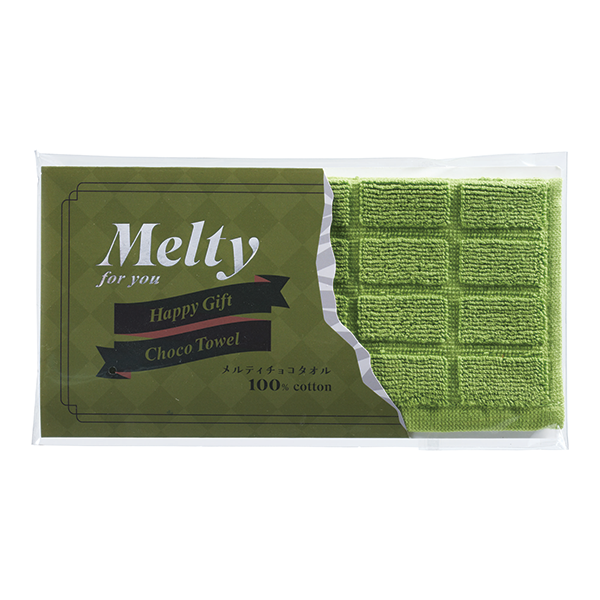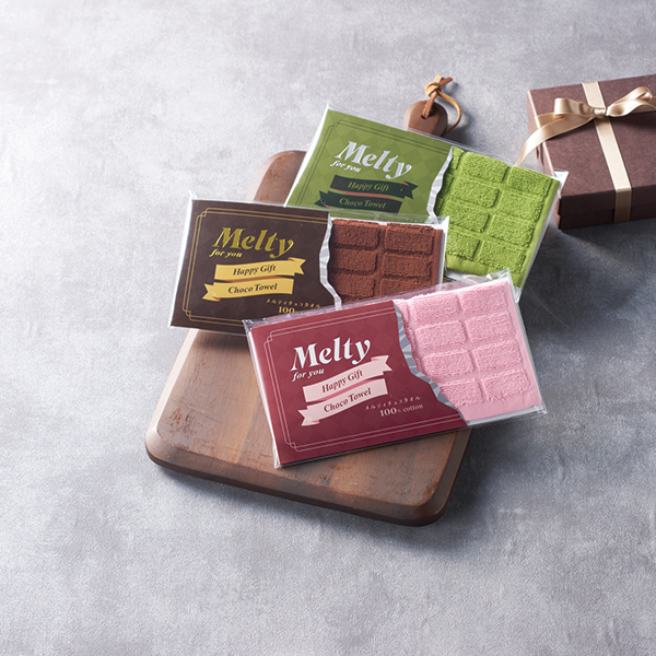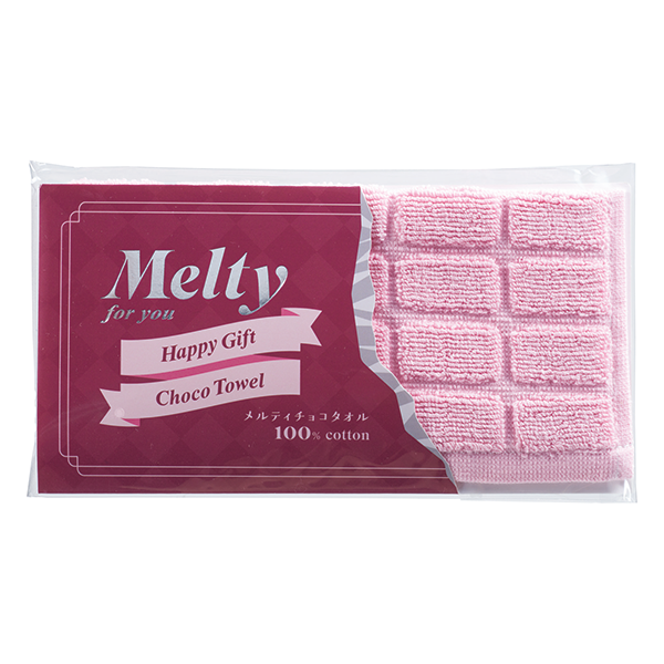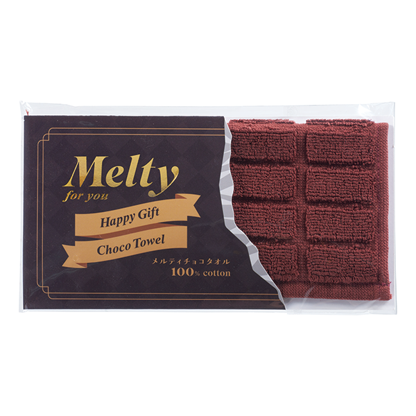 ユニークで可愛い板チョコ風ハンカチタオルです。 銀紙が破れたような遊び心あるパッケージで、箔押しロゴがきらめき、高級感を演出しています。