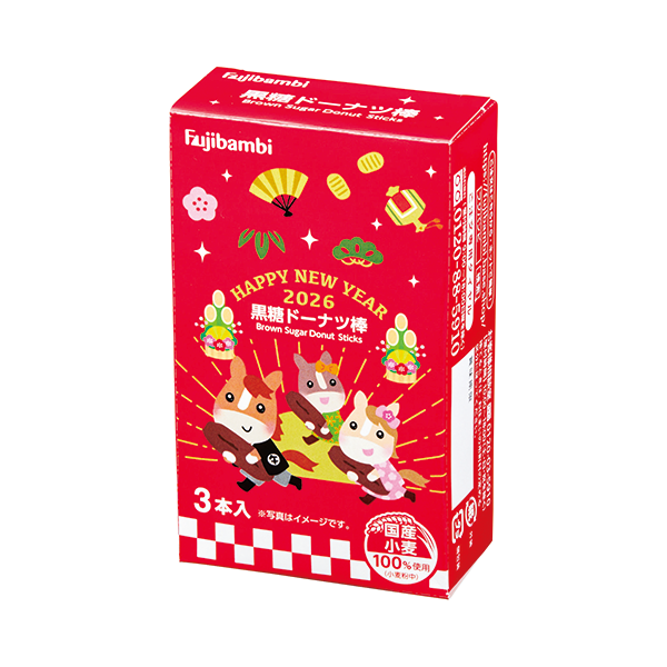 【11月下旬以降のお届け】2026年の干支をモチーフにした化粧箱に黒糖ドーナツ棒が3本入っている、年末年始の挨拶回りなどに最適なプレゼント品です。