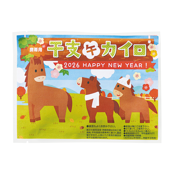 新年を迎える寒い冬の時期に喜ばれるカイロ。 2026年干支の「午」が、かわいらしくデザインされた年始の挨拶に配りやすい商品です。