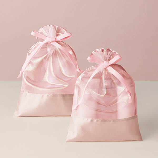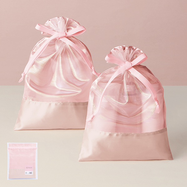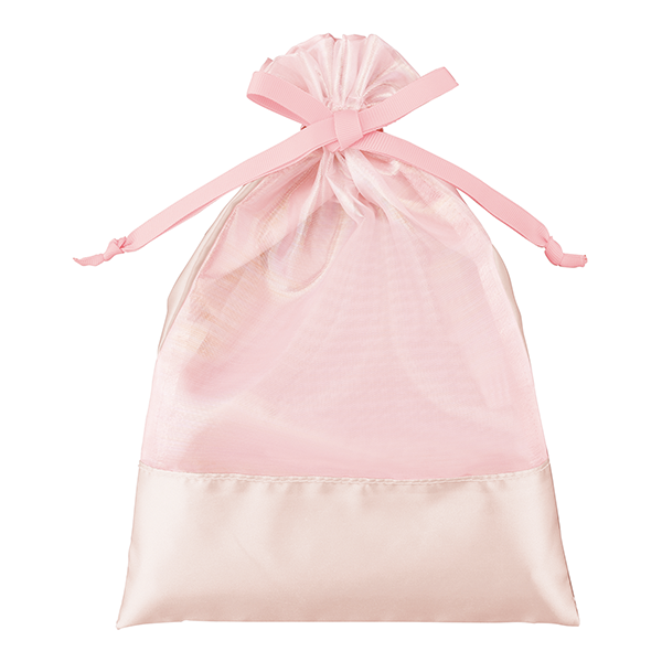 角度の変化できらめくオーロラカラーがポイント。特別なノベルティを演出する、ギフト感溢れる一品。 ノベルティとしてそのまま配布するほか、中身が透けて見えるのでラッピング資材やギフトパッケージにもおすすめの、特別感がある見映えの巾着です。