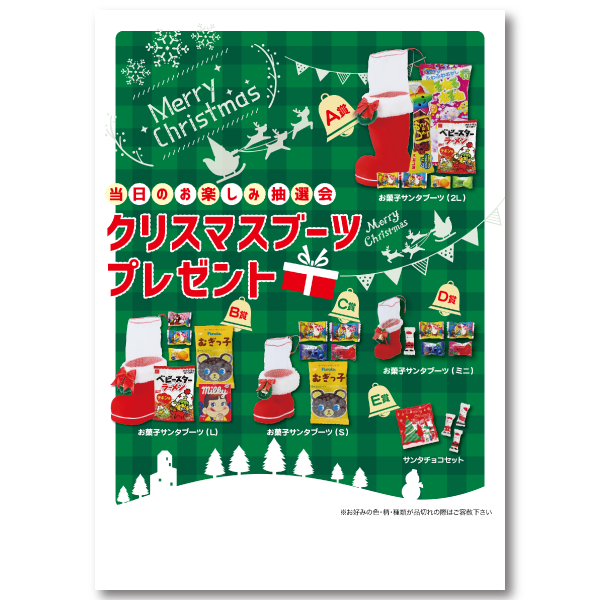 | 容量 | A賞(お菓子サンタブーツ2L)×1、B賞(お菓子サンタブーツL)×2、C賞(お菓子サンタブーツS)×3、D賞(お菓子サンタブーツミニ)×4、E賞(サンタチョコセット)×40、A3ポスター×1、店頭用POP×2、抽選箱&くじ&明細表 |