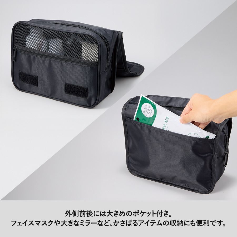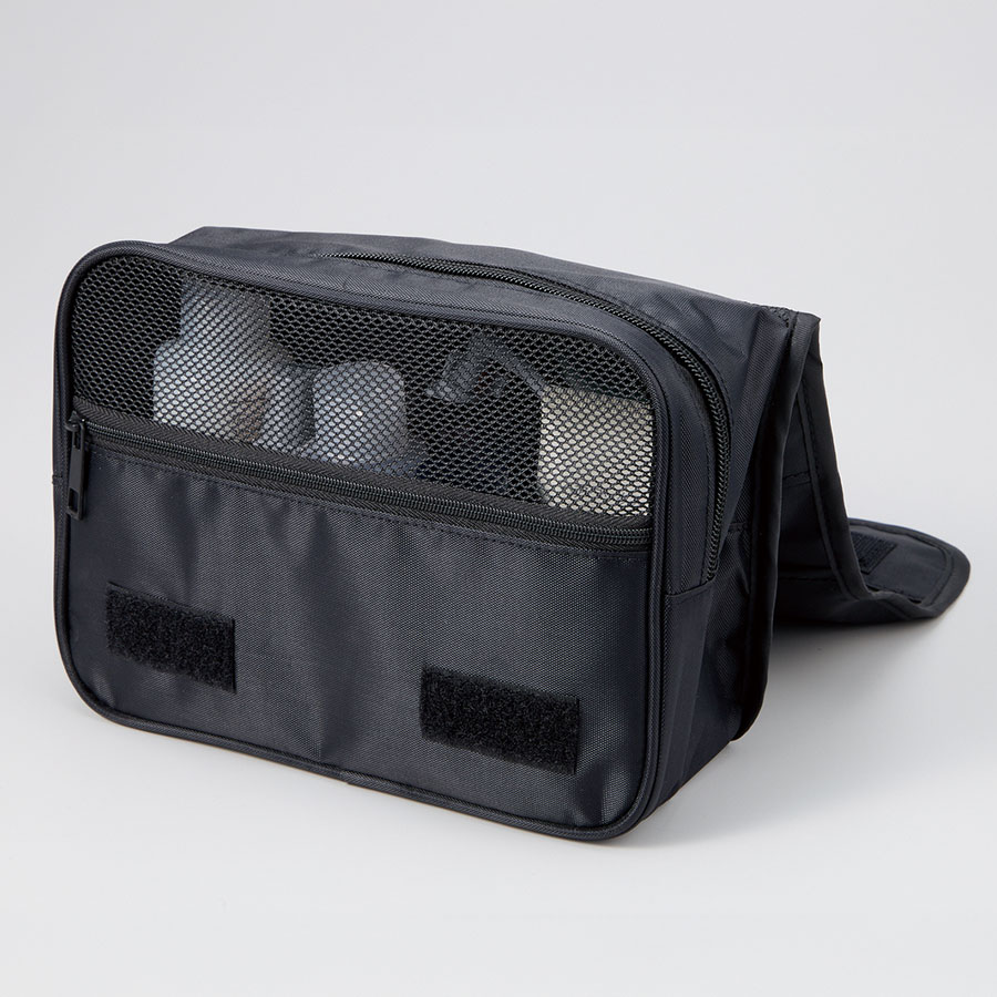 上部はメッシュポケットが2つ、下部はメッシュポーチに分れており、用途別に仕分けが可能です。