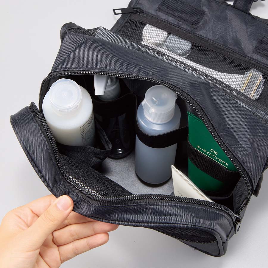化粧品のボトルがそのまま入るような余裕のあるサイズ感で長期の出張や旅行にもぴったりです。