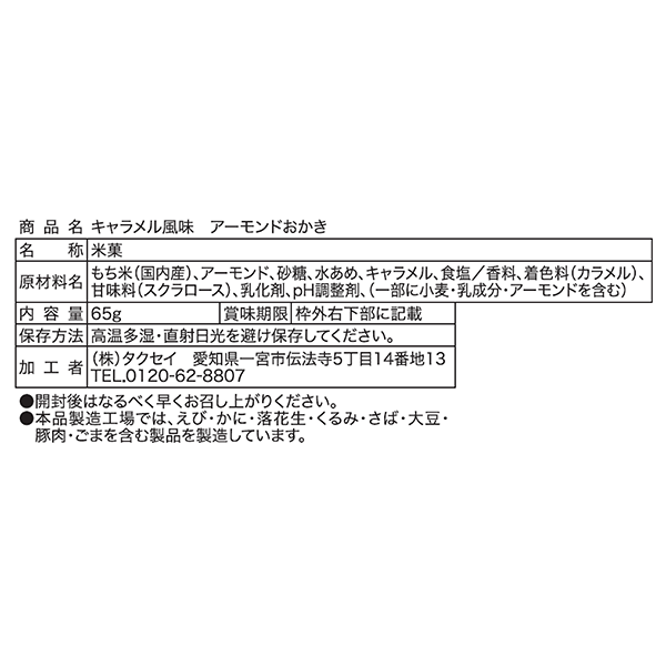 和風のおかきと洋風のキャラメル&アーモンドのマリアージュ!香ばしさとともに甘じょっぱい味わいがあと引く美味しさです。