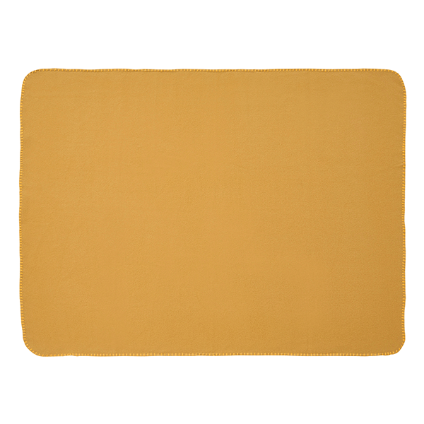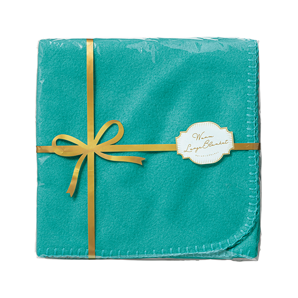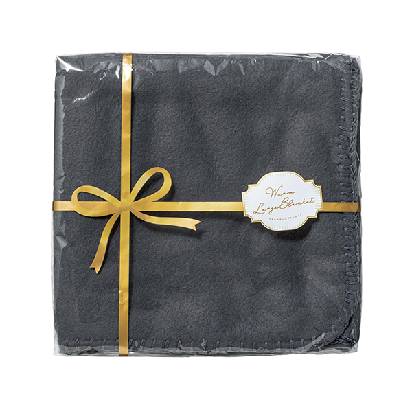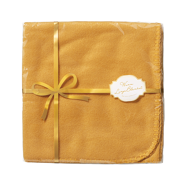 ゴールドのリボンでラッピングしたかのようなパッケージがポイント。ちょっと大きめのフリースブランケットです。