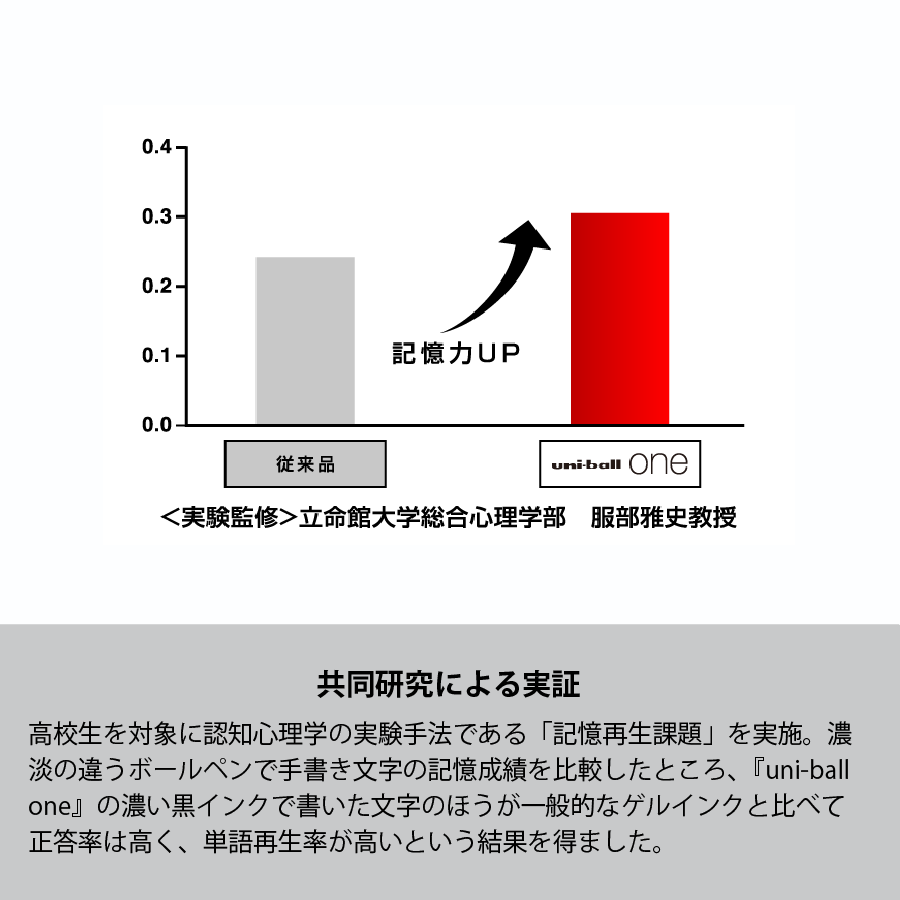 特徴は三菱鉛筆が独自開発した濃く鮮やかに発色するインク。視認性が高まることから記憶に残りやすい効果があります。ボール径は0.5mmでしっかりとした筆記が可能です。