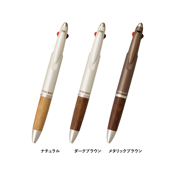 ウイスキー樽のオーク材を再利用した高級感のある3色ボールペンです。 記念品やギフトとして高い人気を誇ります。長く使うことでグリップ部分の木肌の色の深みが増してツヤが出てくるため、一度使い始めると手放せません。木の優しい質感とぬくもりが手にしっくりなじむ、生涯を共にしたい一本です。