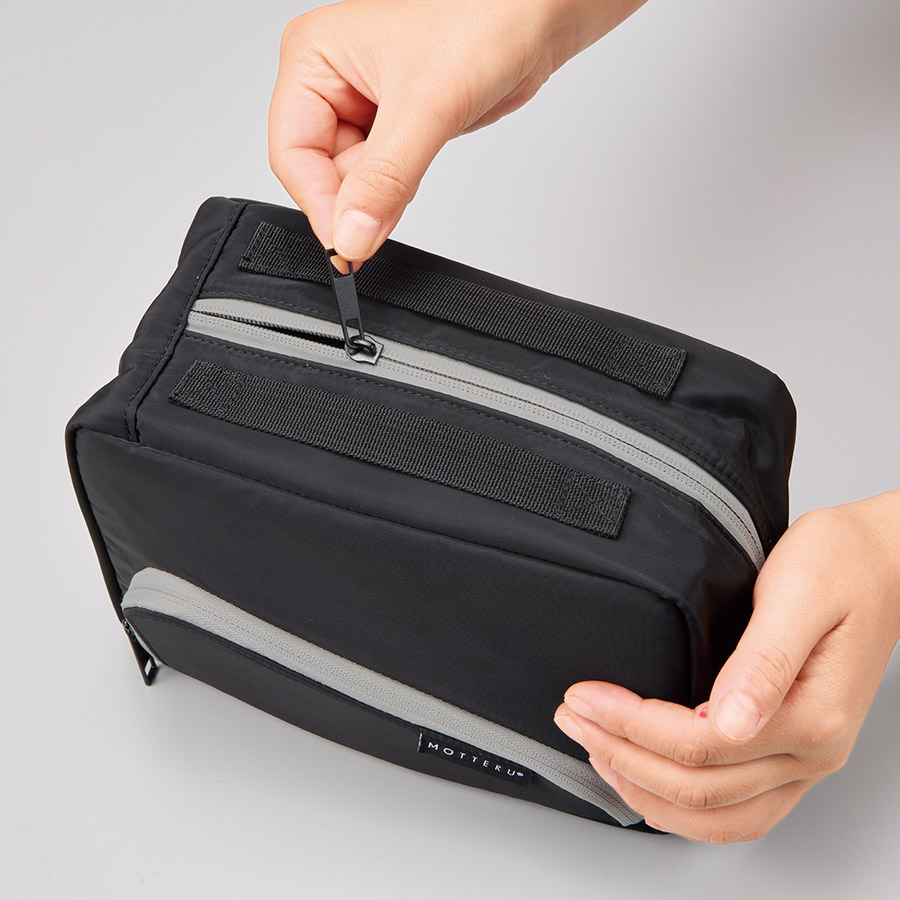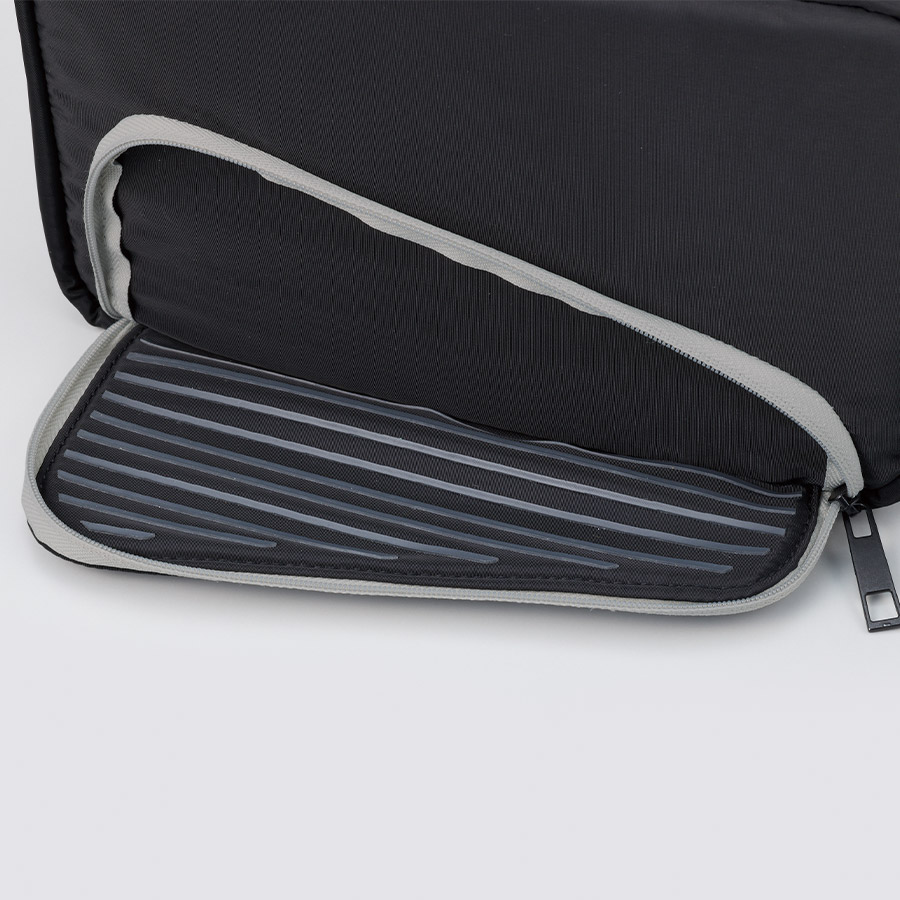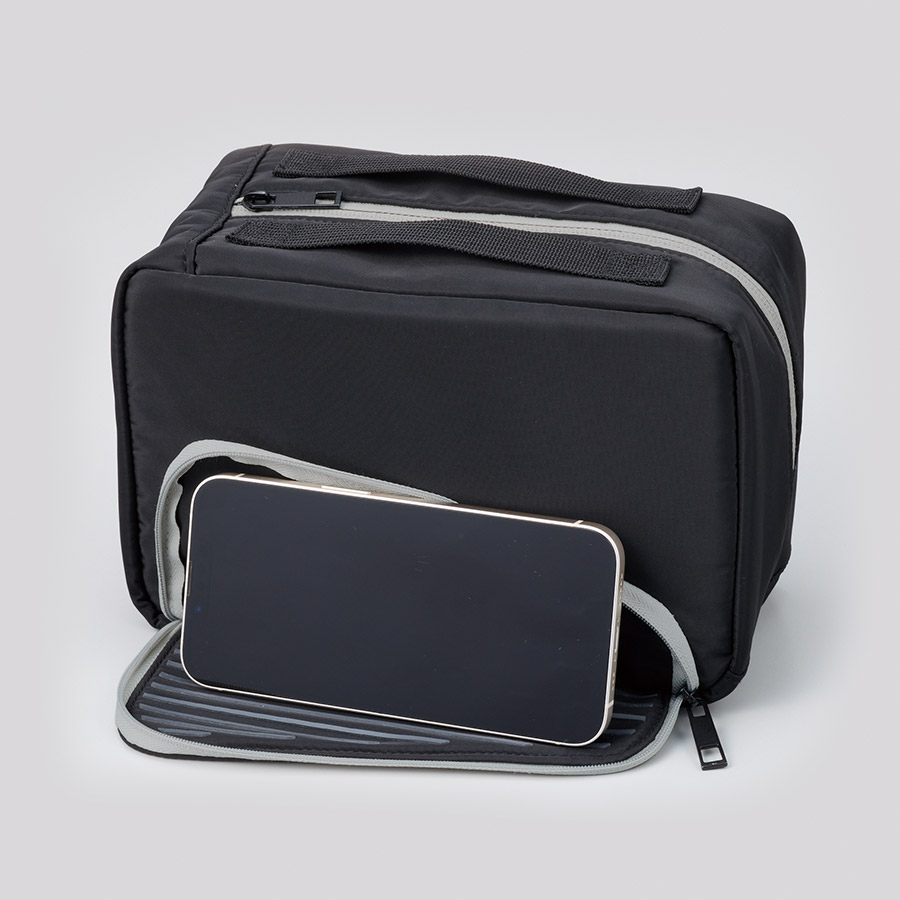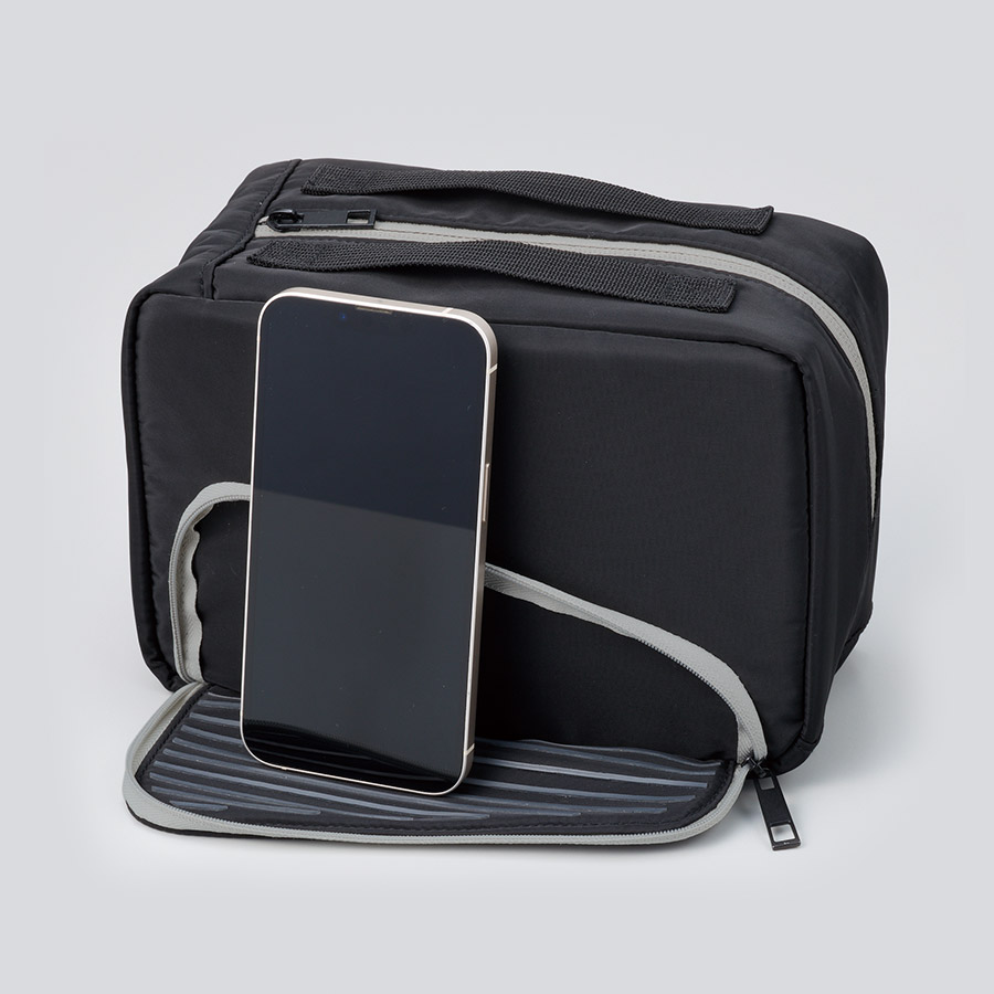 前面のファスナーを開けると、シリコン印刷された生地部分にスマホを引っ掛けて立たせることができ、動画やSNSを見やすい角度で視聴することができます。