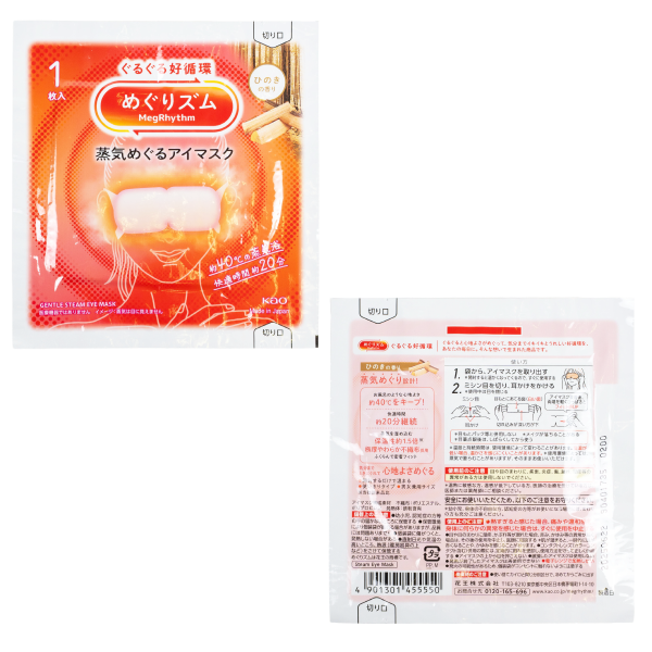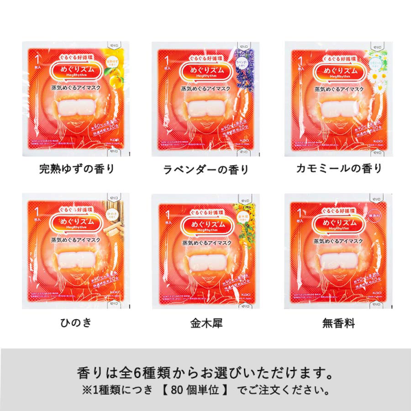 心地よい蒸気で気分をリセットできる「めぐりズム」のホットアイマスクに、オリジナルデザインが可能なチラシを組み合わせたバラマキ向けのアイテムです。