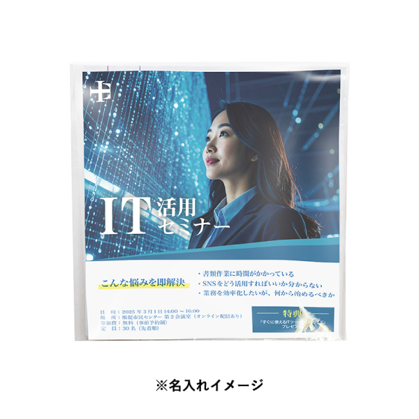 仕事や勉強の合間、移動中のひとときなど、気軽なリフレッシュタイムを提供しながら、企業やブランドの情報をしっかりと届けられる販促アイテムです。チラシにはサービス案内やキャンペーン情報なども盛り込め、視認性と訴求力の高いプロモーションが実現可能。季節を問わず使える癒しアイテムとして、展示会や店頭配布、キャンペーン特典などバラマキにもおすすめです。