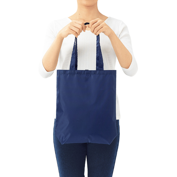 くるっと丸めて付属のゴムでまとめればポケットにすっぽり収まるスマートなエコバッグです。 使いやすい色展開で作りもしっかりしているため洗練された印象を与えられます。A4サイズがするっと入って肩掛けもできる利便性と、コンパクトに折りたためる携帯性の高さは日常使いに最適です。シンプルでユニセックスなデザインのため幅広い層へのアプローチが可能で、来場記念品や購入特典のノベルティとしておすすめです。
