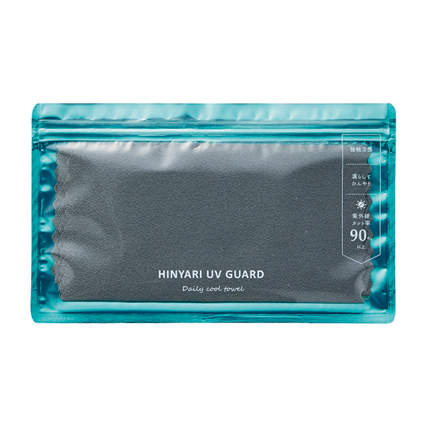 接触涼感生地で水に濡らすとさらにひんやりするクールタオル。首元を紫外線から守るUVカット機能もうれしいもの。 パッケージもクールな外観で夏の販促に最適です。