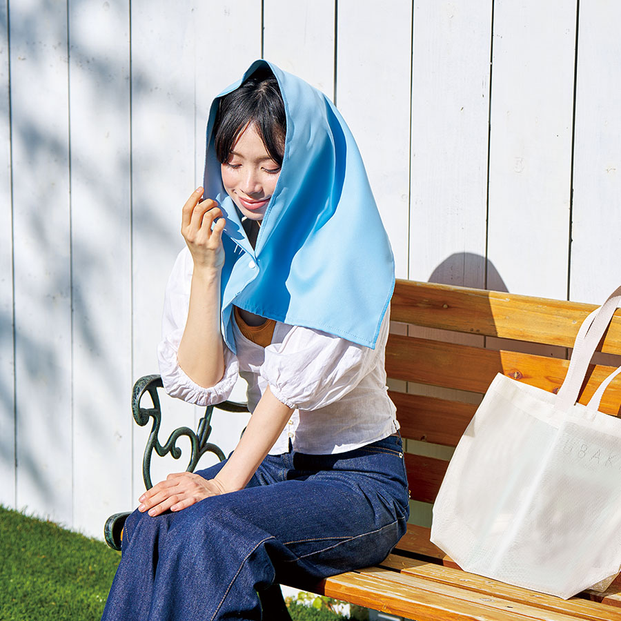 顔だけでなく首や肩も守れるUVカットタオルです。