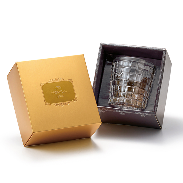 ほどよい重厚感とホールド感。大人のためのロックグラスをプレミアムなゴールドボックスに納めました。 手にしっくりなじむサイズ感で、ウイスキーや焼酎の時間を上質に演出します。落ち着いたデザインと化粧箱入りで、企業ノベルティや記念品、大人向けのギフトに最適な一品です。