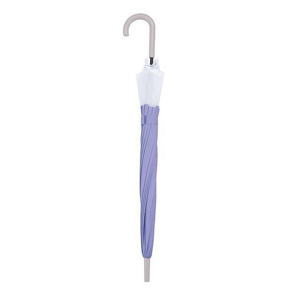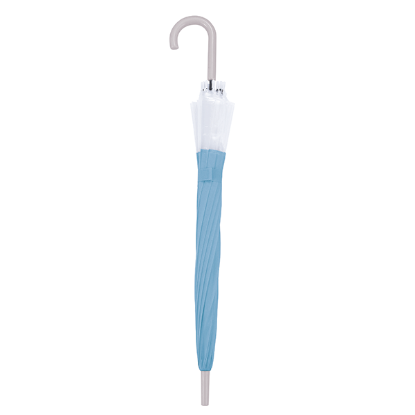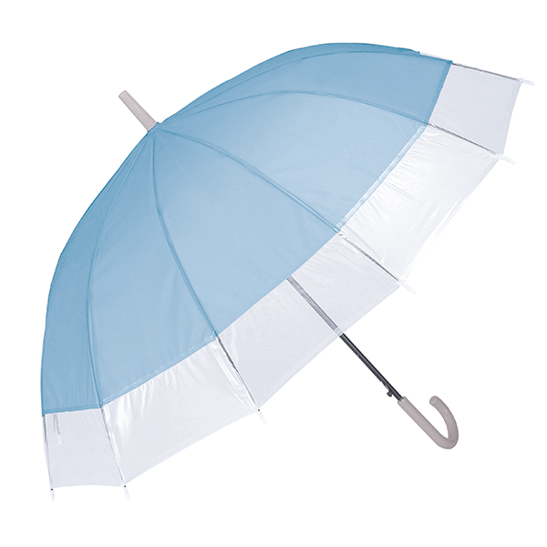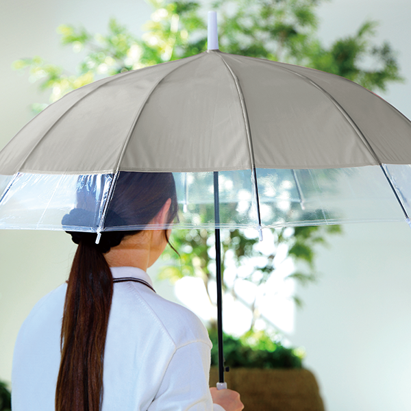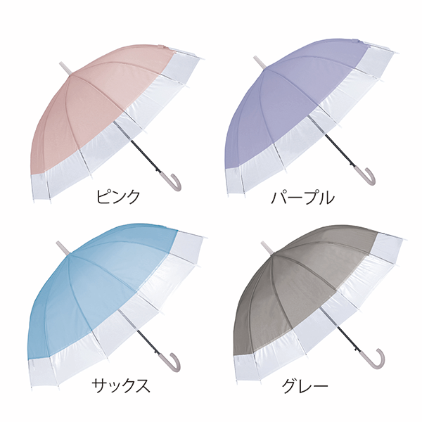 グラスファイバー骨12本の耐久性に優れた傘。クリア×カラーのバイカラーでさり気なくセンスもアピールします。 春夏はUVケアや暑さ対策など、女性の関心が特に高い時期なので、おしゃれや悩みにマッチする販促品をノベルティにすると喜ばれます。ファッションやインテリア、美容関連のイベントにどうぞ。