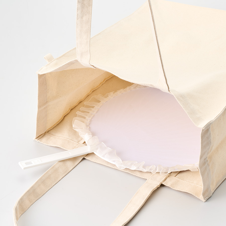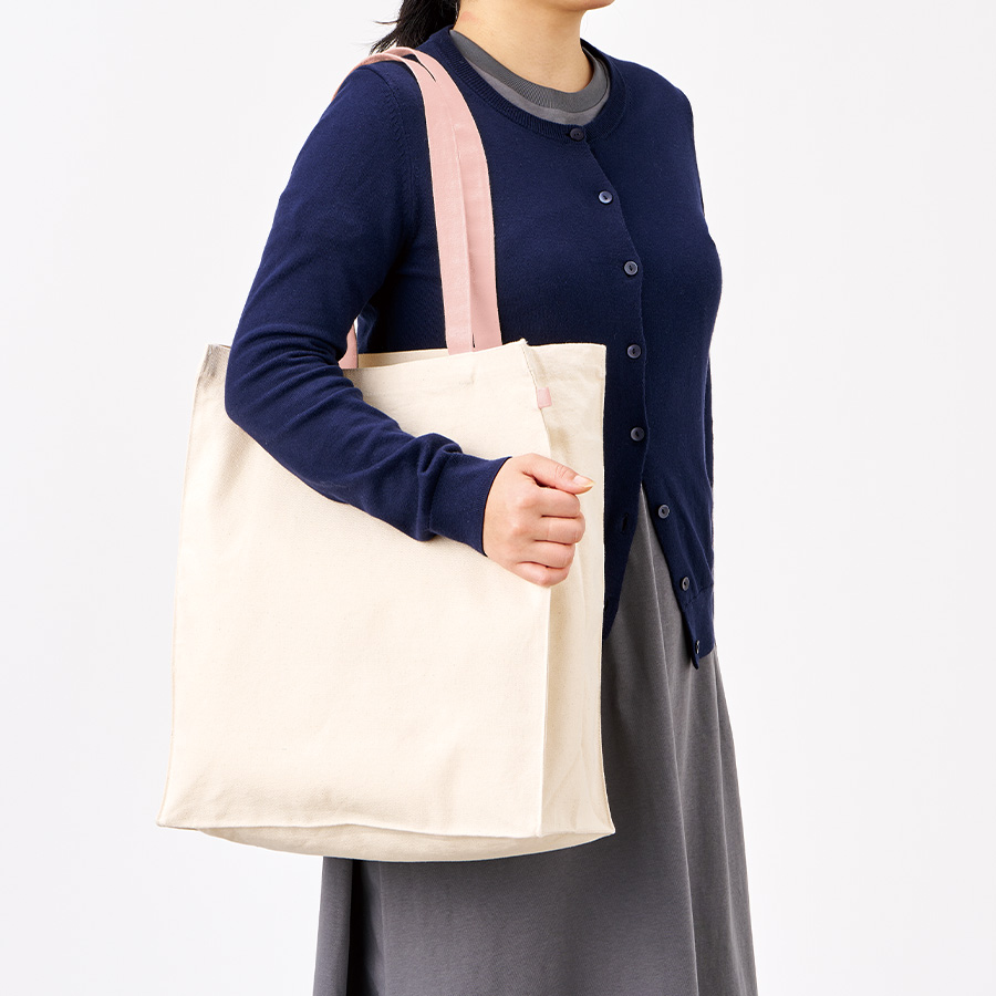 バッグ本体は共通のナチュラルカラーで、ハンドルとループは10色展開のためキャラクターやブランド、企業カラーなど案件に合わせてご提案いただけます。