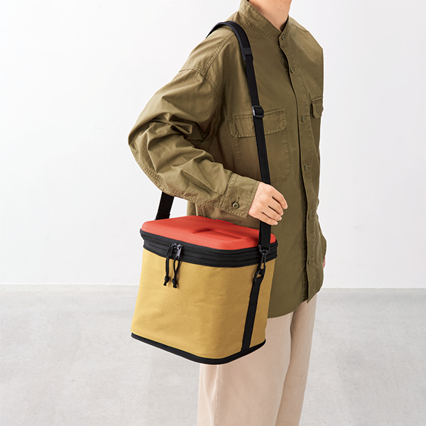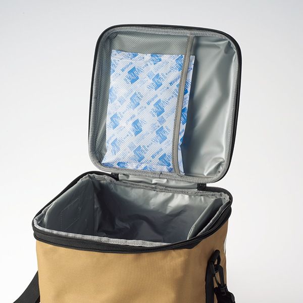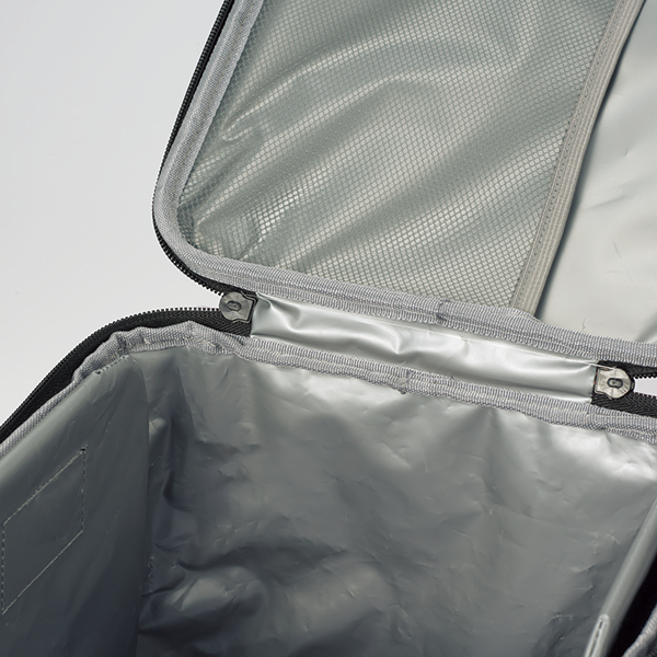 上下面がハードシェル仕様の畳める保冷温バッグ。 ファスナー開閉で折りたたむことができ、テーブルになるオプション機能付き。