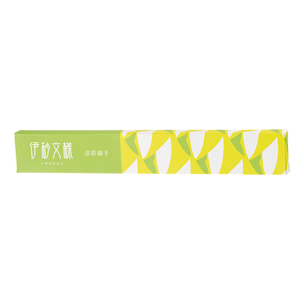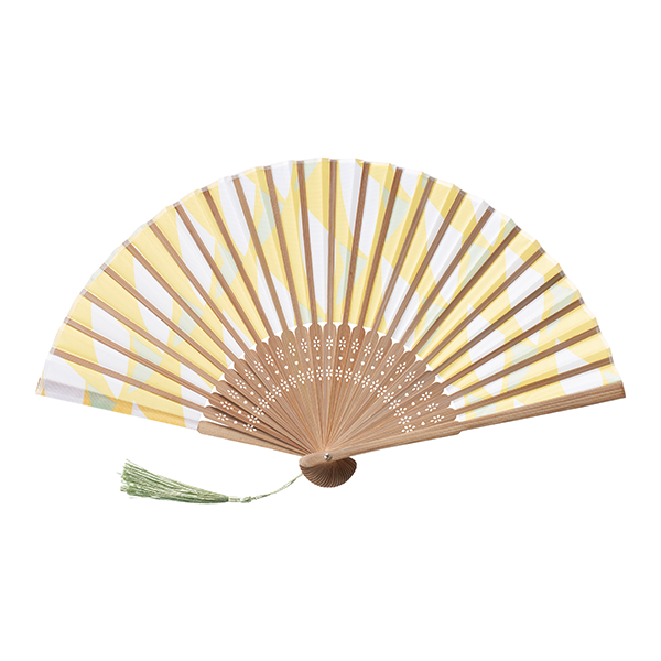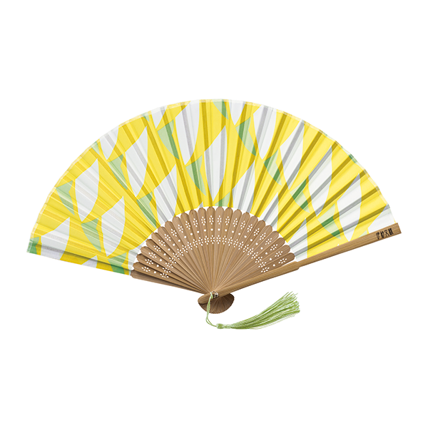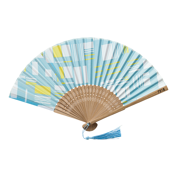 伊砂文様シリーズの新しい夏柄を使用したおしゃれで爽やかな扇子。 涼しい色味と文様で構成されたモダン和柄に、持ち手部分に伊砂文様のロゴとタッセル付き。